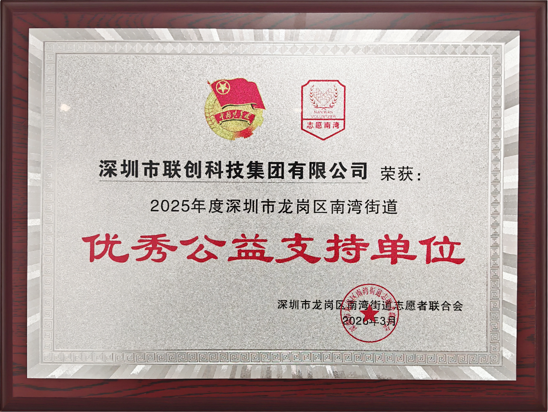 联创科技集团荣获“2025年度南湾街道优秀公益支持单位”称号