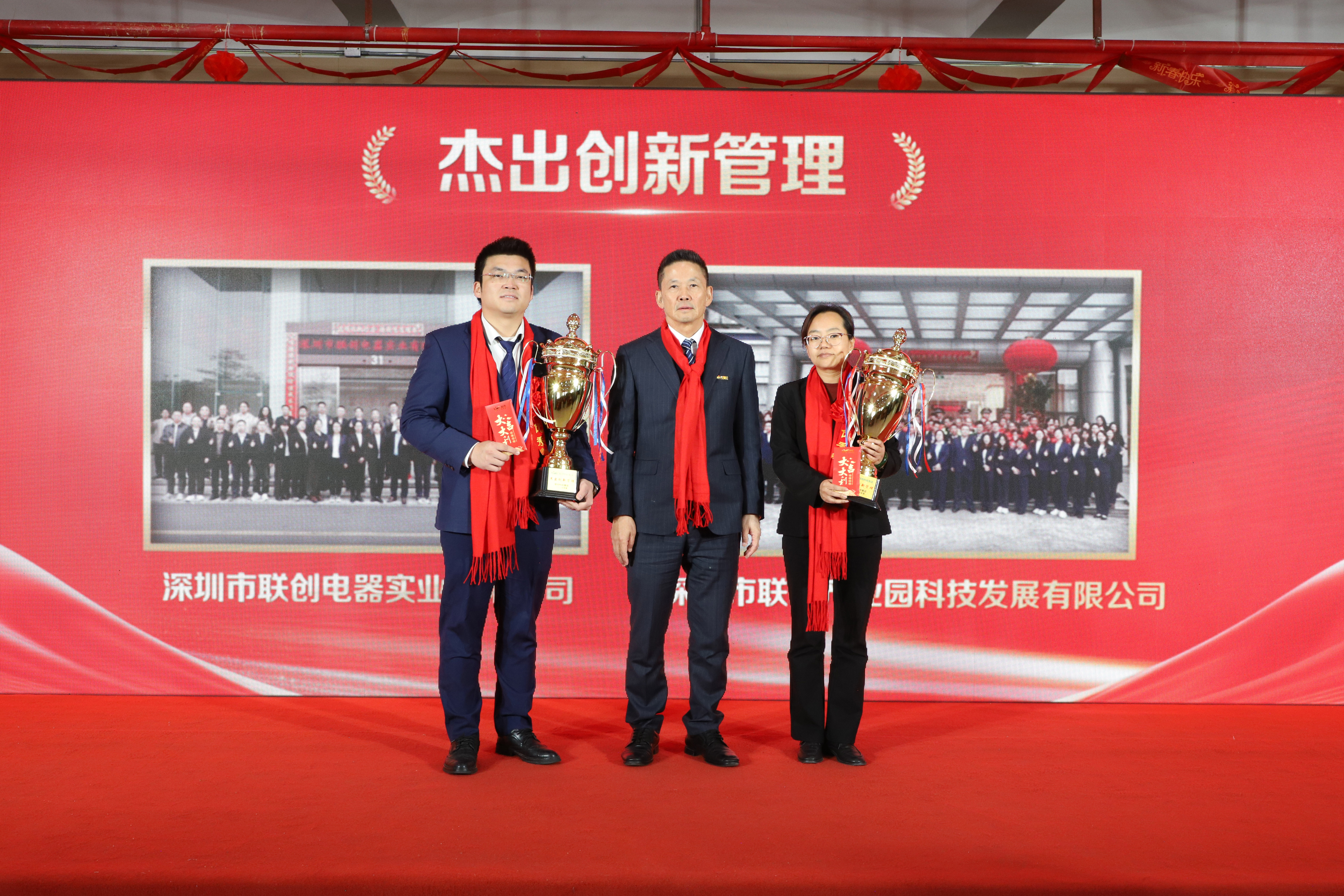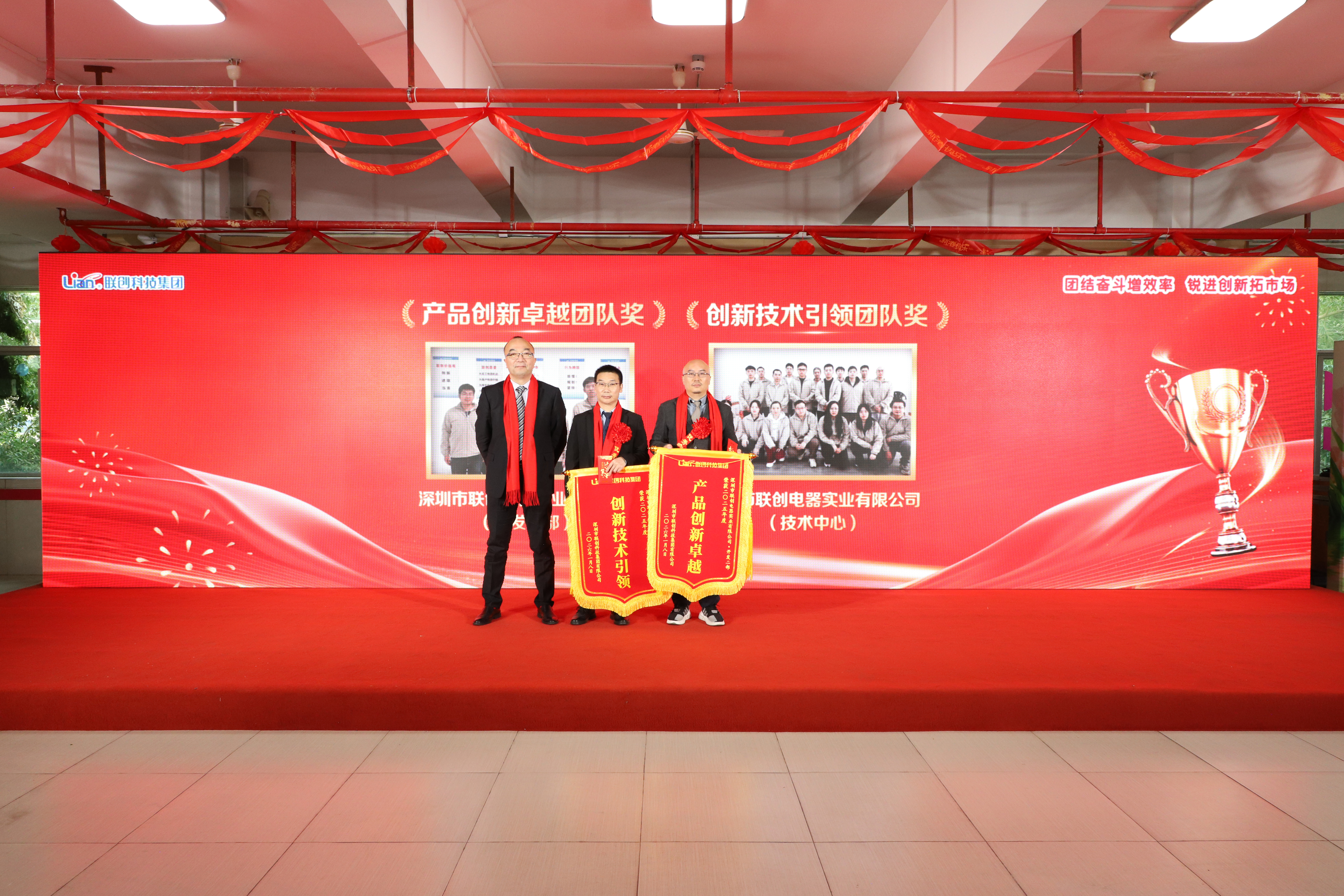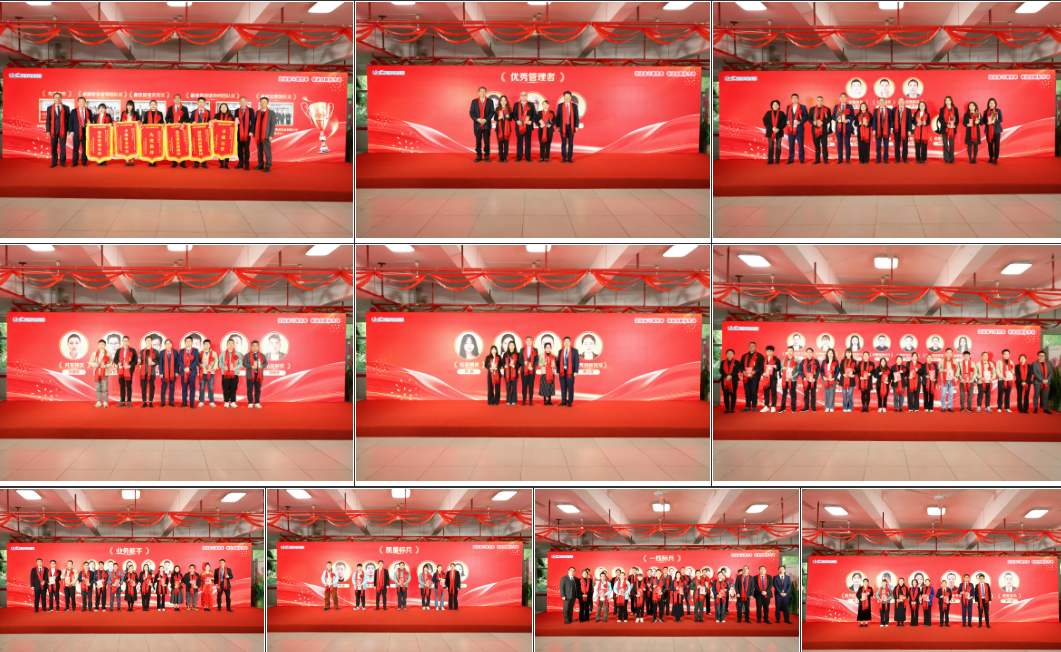 在隆重的颁奖环节,董事长赖伴来、董事长夫人邓冬霞、高智能家电集团总裁 Franky Ho、特邀嘉宾、公司股东、专家顾问、各业务板块负责人、各级人大代表及党代表分批登台,为获奖代表颁授荣誉证书、奖杯、锦旗及奖金。他们的亲自颁奖,不仅是对获奖者成绩的至高肯定,也将现场的热烈氛围一次次推向高潮。