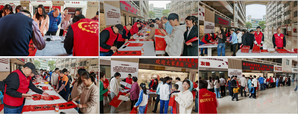 1月30日中午12时至下午16时,联创科技园党群活动中心暖意融融、墨香四溢。为迎接即将到来的新春佳节,园区党委、工联会、关工委、团委联合南湾街道两新组织党委邀请辖区12位知名书法家,共同开展“迎春送福,翰墨传情”义写春联活动,为园区职工及家属送上诚挚的新春祝福。作为联创党委工会连续多年坚持开展的春节暖心品牌活动,写春联送福已成为每年节前园区一道温馨的风景线,承载着组织对职工家庭的持续关怀。